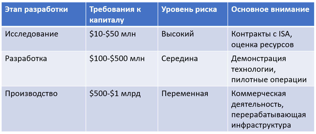 Развитие конкурентоспособных возможностей глубоководной добычи полезных ископаемых требует значительных капиталовложений. Ориентировочные затраты на первые коммерческие операции составляют от 500 до 800 миллионов долларов США и включают системы сбора, суда обеспечения и инфраструктуру переработки.