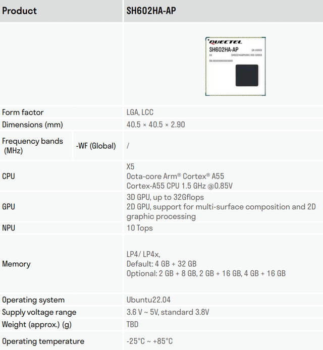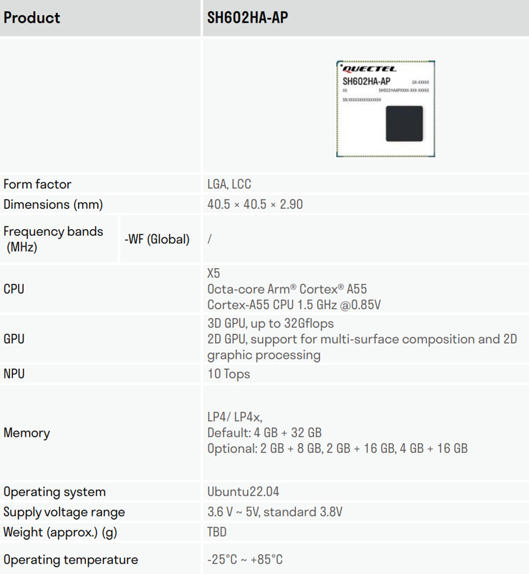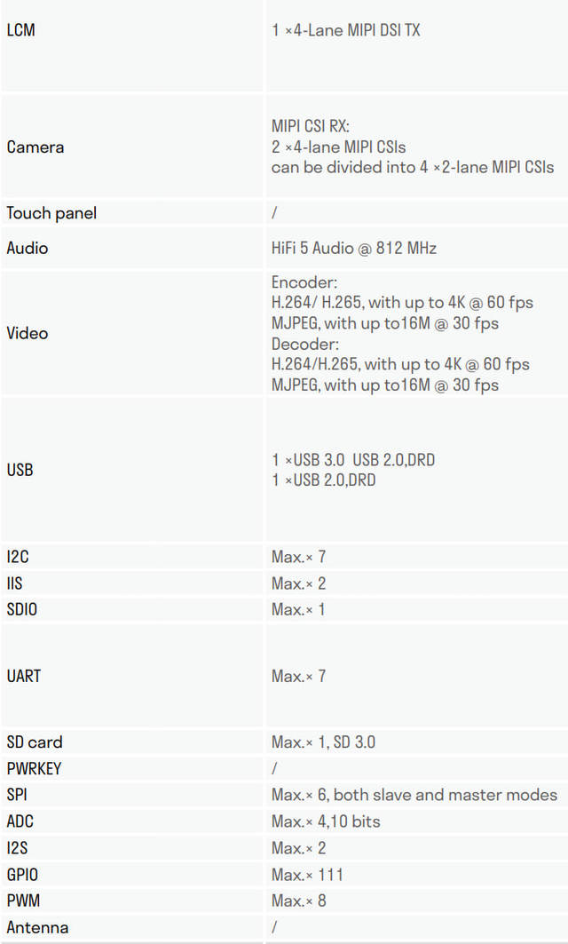 Встроенная память модуля - 4 ГБ с возможностью расширения до 32 ГБ. Поддерживается кодирование и декодирование 4K-видео @ 60 кадров/с. Модуль обеспечен различными интерфейсами: USB 3.0/2.0, RGMII, SDIO, QSPI, а также множеством UART и I2C портов. Размеры: 40.5 x 40.5 x 2.90 мм, рабочие температуры: -25°C ~ +85°C.