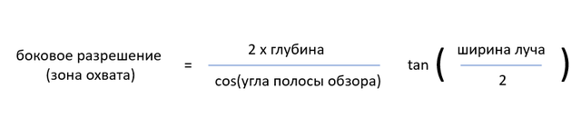 Формула показывает, что боковое разрешение ухудшается с увеличением глубины воды, ширины луча и угла обзора, что приводит к увеличению площади охвата морского дна на глубине.