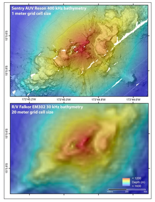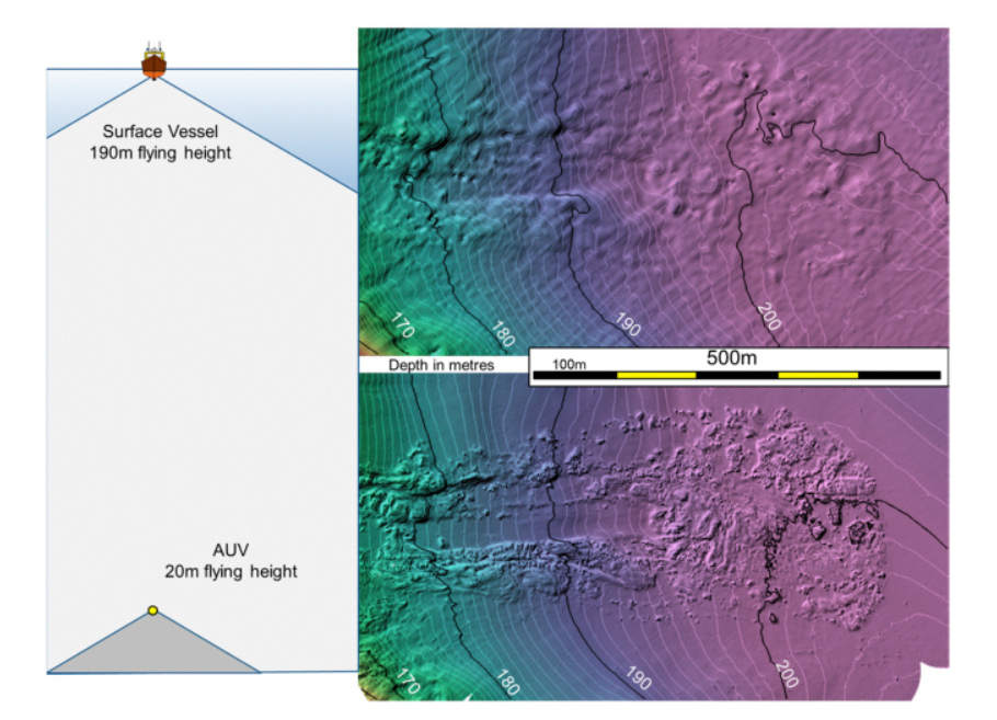 Рисунок, предоставленный Институтом океанографии Шмидта, наглядно демонстрирует ситуацию. Один и тот же глубоководный вулканический рельеф был картирован с помощью AUV Sentry с многолучевым эхолотом Reson 400 кГц, работавшего примерно в 70 м над морским дном и создавшего сетку с шагом 1 м, а также с помощью научно-исследовательского судна R/V Falkor с многолучевым эхолотом EM302 30 кГц, работавшим с поверхности, что позволило сформировать сетку с шагом 20 м. Карта, созданная с помощью автономного подводного аппарата, обеспечивает примерно в 20 раз более высокое разрешение, четко отображая такие особенности, как извержения, вулканические кратеры, лавовые потоки, разломы, трещины и оползни — детали, которые невозможно обнаружить с помощью системы, установленной на корпусе судна.