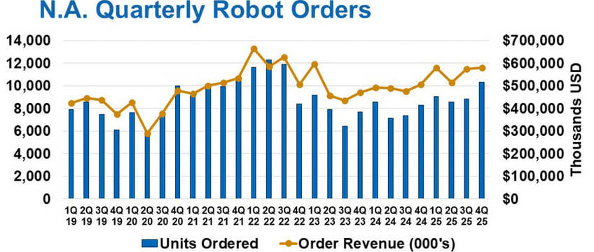 В 4q2025 компании заказали 10,3 тысяч роботов на $579 млн, что превзошло результаты аналогичного периода 2024 года на 6,6% по количеству единиц и на 8,7% по выручке. Речь идет о шестом квартале роста год к году подряд.