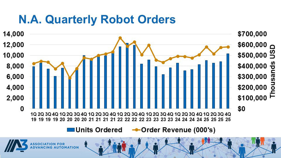 16.02.2026По данным Ассоциации по развитию автоматизации (A3) заказы на роботов в Северной Америке в 2025 году выросли на 6,6% по количеству единиц и на 10,1% по выручке по сравнению с результатами 2024 года. Рост наблюдается в автопроме и среди OEM-производителей, однако основным драйвером рынка стал спрос со стороны неавтомобильных клиентов. Речь идет, в частности, о пищевой промышленности, товарах народного потребления, производителях полупроводников и электроники, а также компаниях из отрасли биотехнологий и медицины.