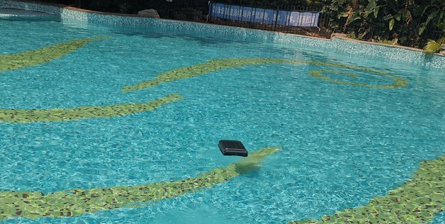 Пример робота для очистки поверхности воды от падающего мусора - листьев, насекомых, других небольших объектов, которые менее плотные, чем вода и некоторое время остаются на поверхности. Такой робот практически бесшумен, он неспешно перемещается по бассейну и собирает загрязнения во внутренний контейнер, например, с помощью транспортера или просто улавливает их с помощью направляющих поверхностей.