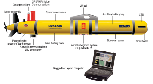 АНПА. Подводный автономный необитаемый аппарат. Назначение двойное. Для использования силовыми структурами может требоваться адаптация. . Оснащение: эхолот, гидролокатор бокового обзора, допплеровский лаг, гидроакустическая система позиционирования и связи, спутниковая и инерциальная навигационные системы, измерители глубины и скорости. Аккумулятор: 1200 Втч литий-железо-фосфатный. Гидроакустическая система работает на расстоянии до 3.5 км и позволяет передавать данные со скоростью до 13,9 кбит/с. На поверхности дальность связи по Wi-Fi - до 1.5 км.