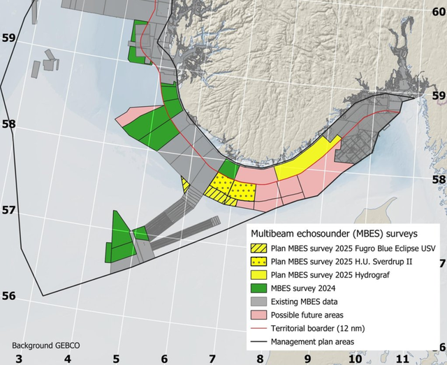 Компания Fugro получила контракт по итогам конкурса, который прошел летом 2025 года, с августа начались работы. В конкурсе принимало участие 6 поставщиков. Стоимость контракта составила 6 000 000 норвежских крон с возможностью опциона до 10 000 000 норвежских крон (опцион был активирован). В контракте с Fugro предусмотрен опцион в размере 1 100 000 норвежских крон на расширение района картографирования в сторону пролива Скагеррак.