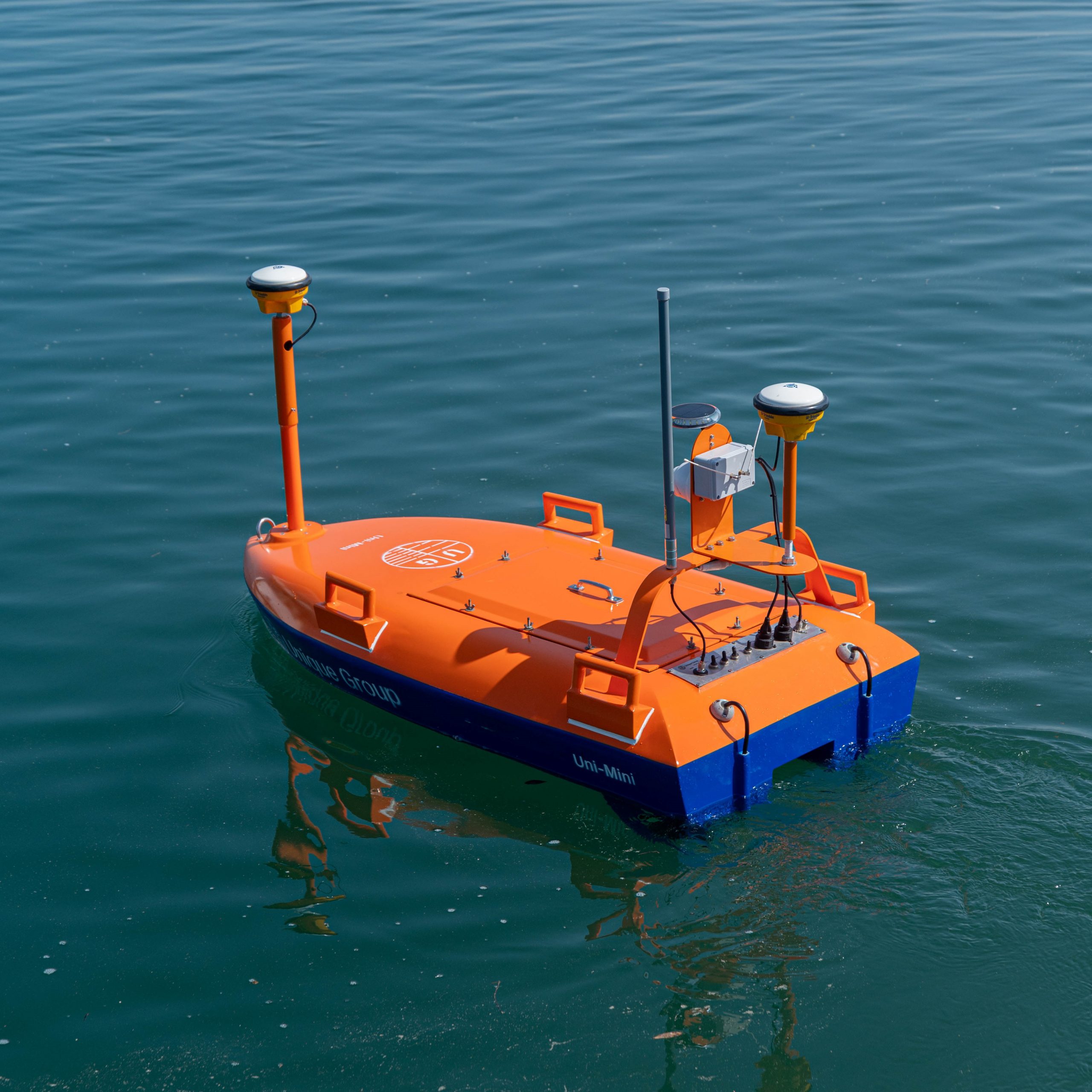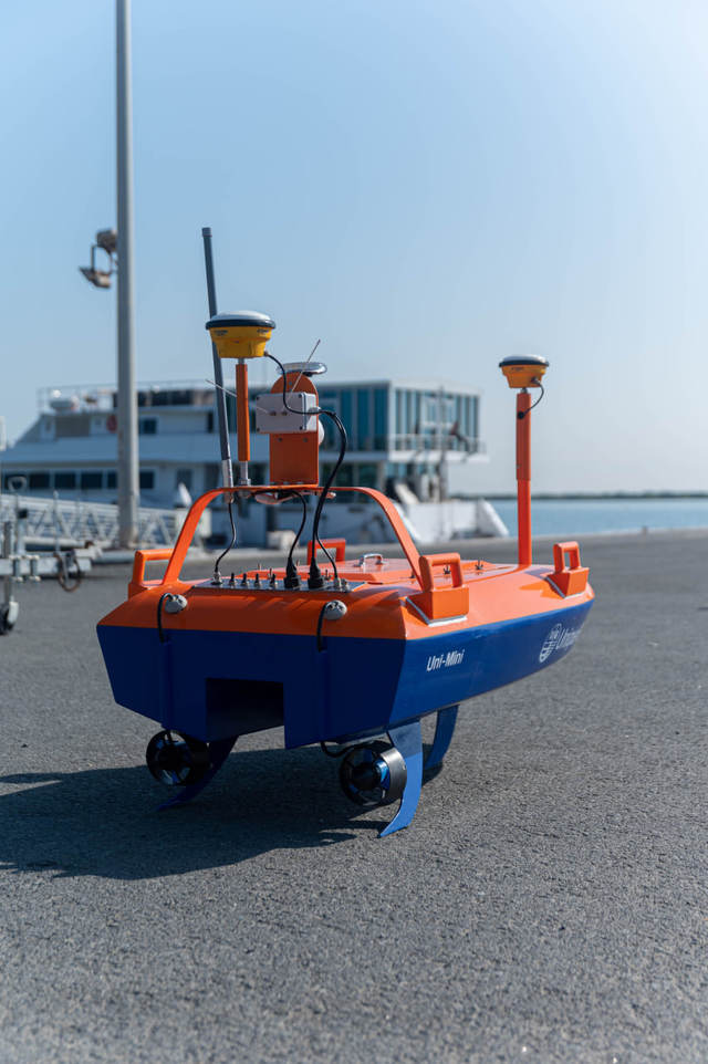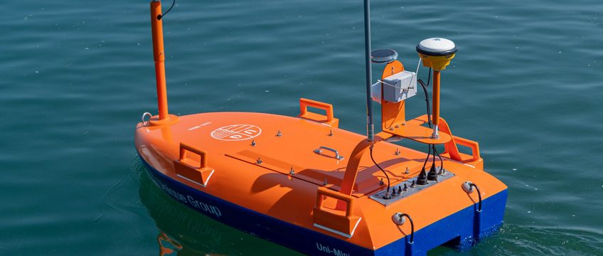 В работах будет использован электрический мини-USV Uni-Mini (сине-оранжевый) с технологией Ping DSP для точной батиметрии в мелководных и экологически чувствительных районах, где нельзя использовать традиционные суда.