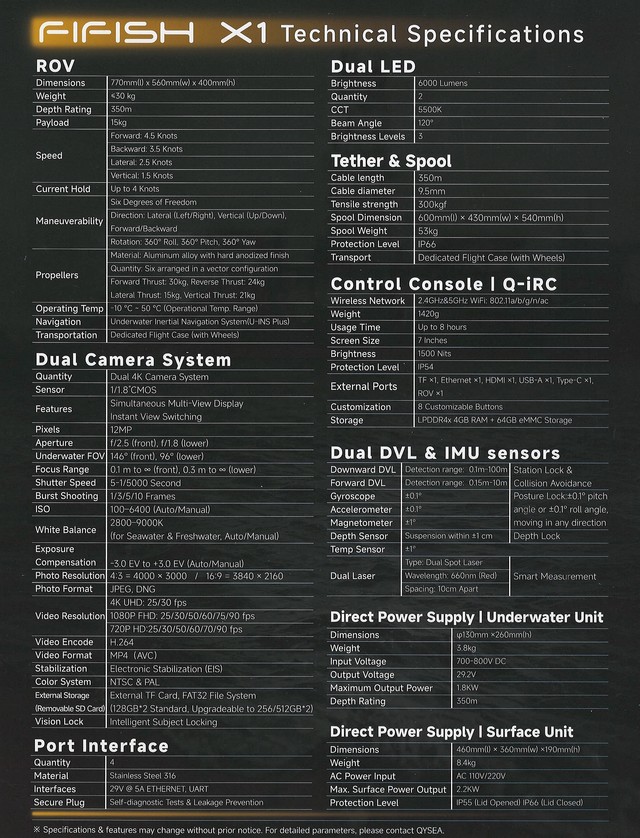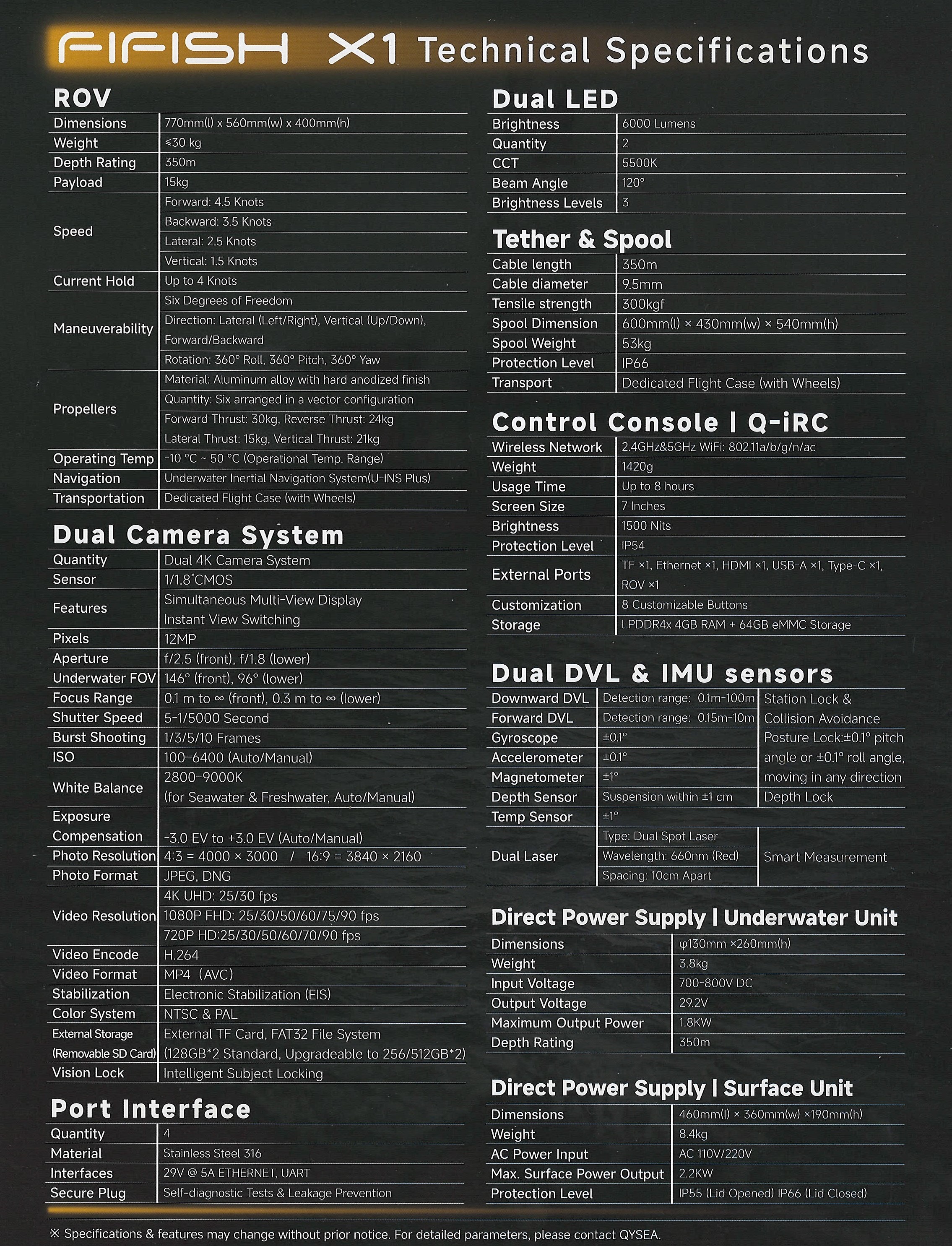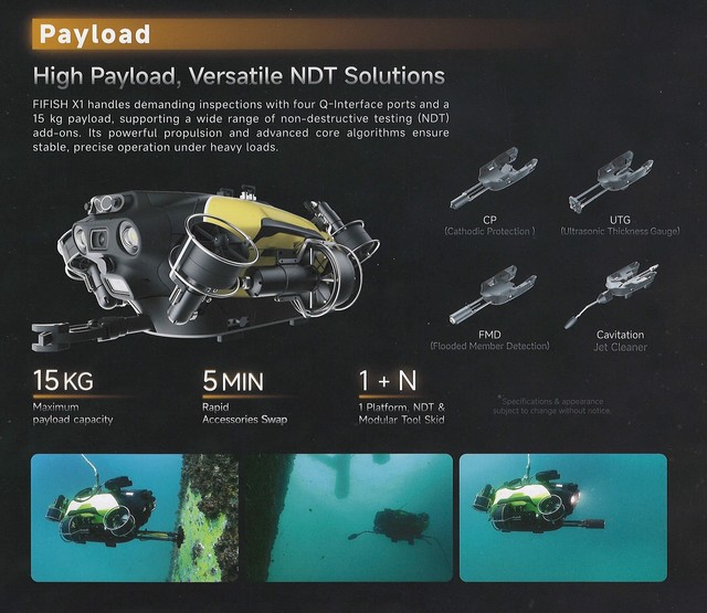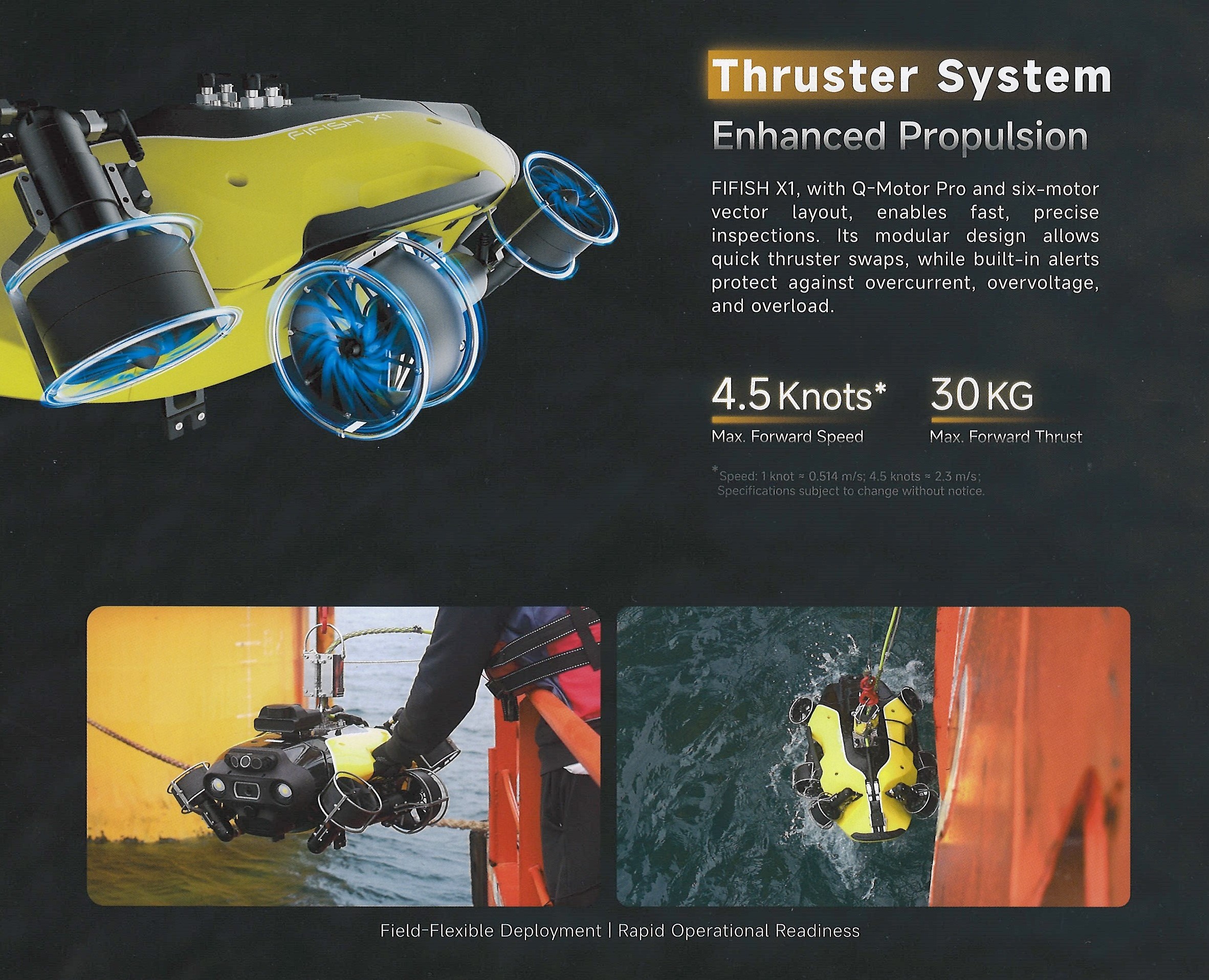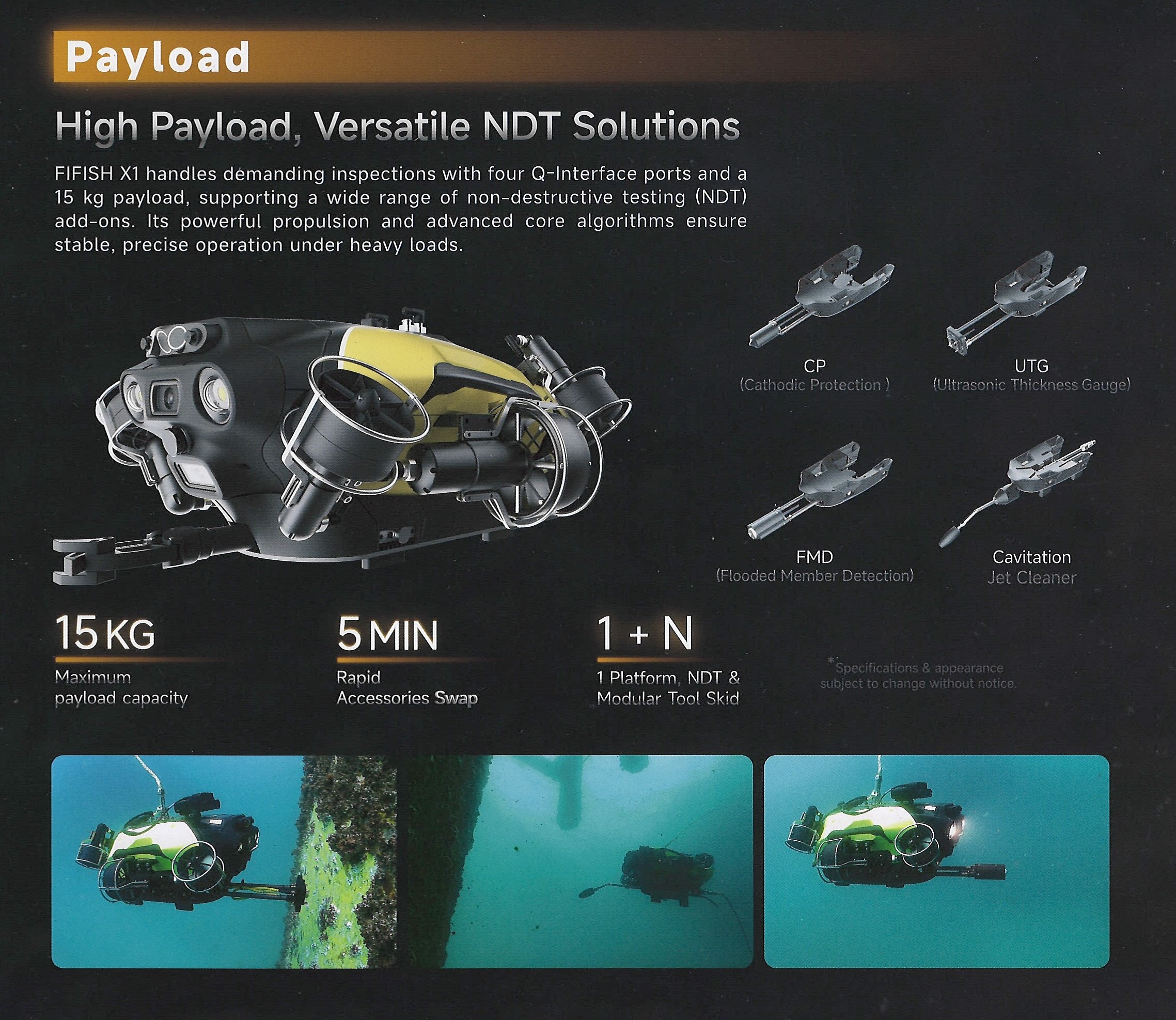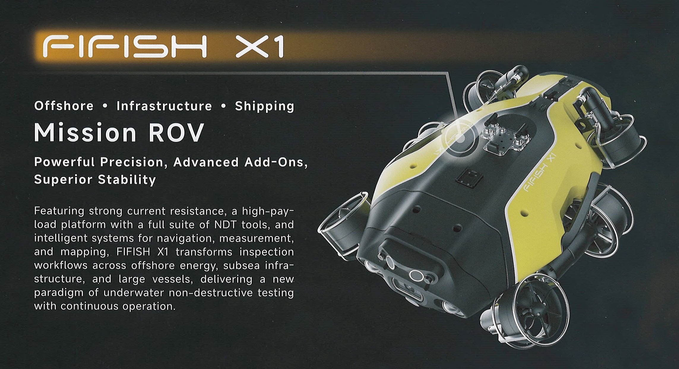 Fifish X1 компания относит к классу «миссионных» ТНПА (ROV). Отмечают такие его возможности, как способность брать на борт сравнительно тяжелую полезную нагрузку, а также возможность удерживать позицию даже в условиях подводных течений. Аппарат предназначен не только для решения задач осмотрового типа, но также для подводного неразрушающего контроля.