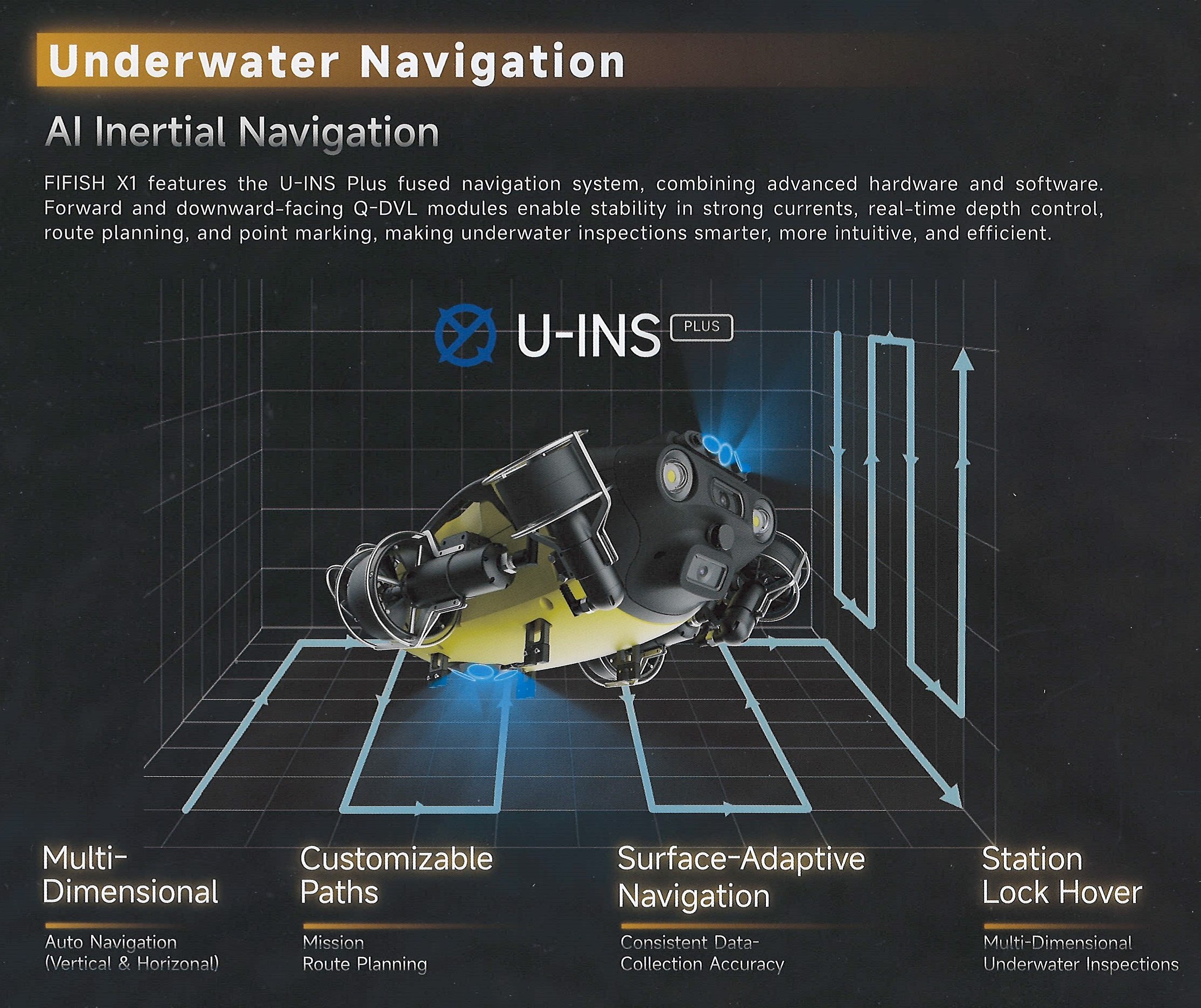 FIFISH X1 оснащён гибридной навигационной системой U-INS Plus, объединяющей аппаратные и программные решения. Передние и нижние модули Q-DVL обеспечивают стабильность в условиях течений, контроль глубины в реальном времени, планирование маршрутов и маркировку точек.