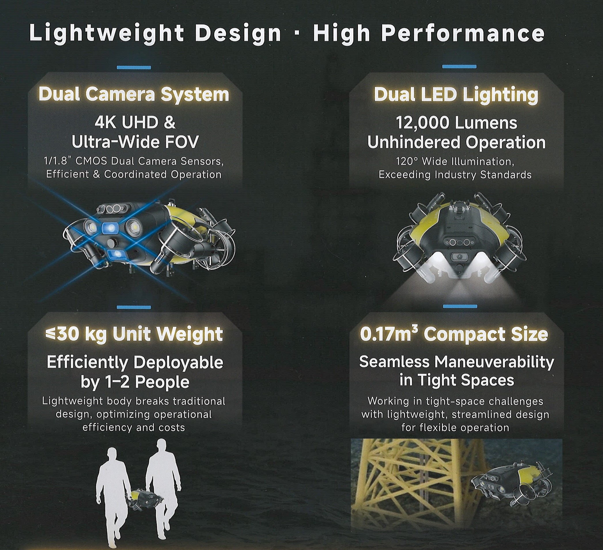- Искусственный интеллект: ИИ в основе управления платформой; визуальный «захват» на базе ИИ; интеллектуальные подводные измерения (AFL - от automatic feature lock, автоматическая фиксация объекта на основе характерных точек; шкала дополненной реальности, что позволяет измерять объекты в кадре (с опорой на точки лазерного излучателя на ТНПА).