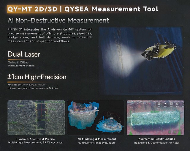 Очень интересная особенность аппаратов и ПО компании. Система на основе ИИ позволяет вести точные измерения морских сооружений, трубопроводов, размывов мостов и повреждений корпусов судов, обеспечивая однокнопочное измерение и рабочие процессы инспекции.